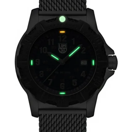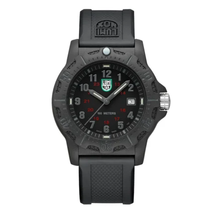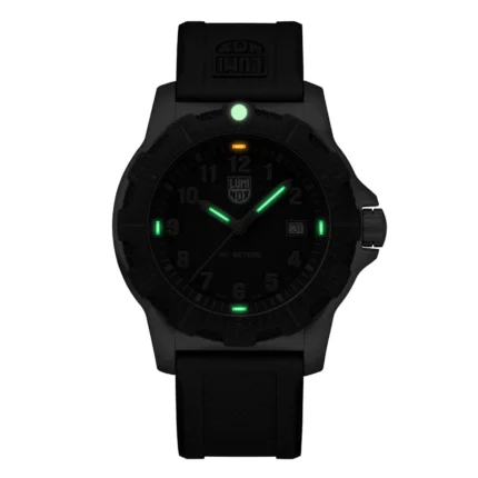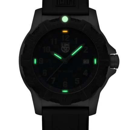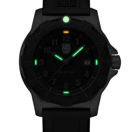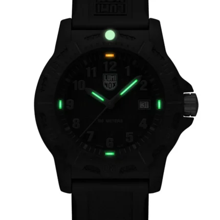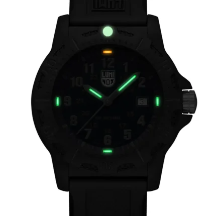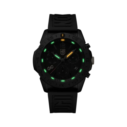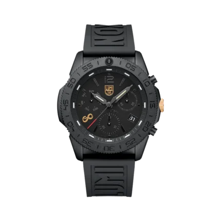 This sleek and sporty chronograph celebrates the 2025 Chinese Year of the Snake and is limited to 288 pieces worldwide. The black dial features a golden Luminox logo, a golden screw in crown and a golden ouroboros snake symbol at 8 o’clock. The Ouroboros serpent represents eternal cyclic renewal or a cycle of life, death and rebirth and is engraved in the IP black plated screw in case back. The 44mm IP black plated stainless steel case boasts a CARBONOX™ unidirectional bezel, a vital instrument for any diver. The black rubber strap with a quick release system allows for an easy and perfect fit. The 15 LLTs in green and orange ensure that this Pacific Diver watch is visible in any condition for up to 25 years.