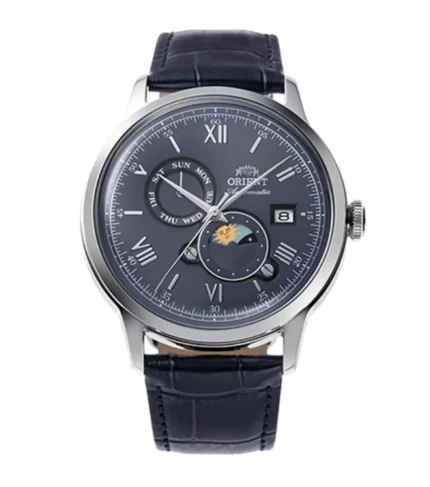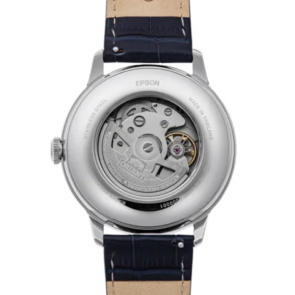 Elegant 41.5mm Orient RA-AK0806L semi skeleton watch with navy dial, open heart design, and automatic movement, crafted for timeless sophistication.