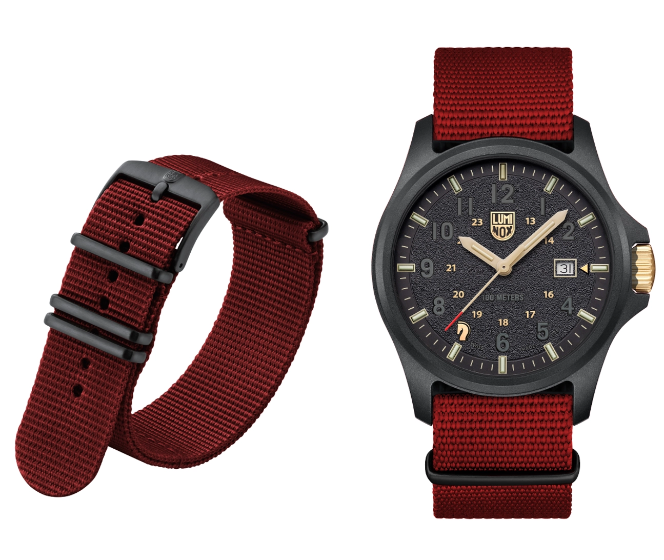 Limited to 600 pieces worldwide, this special edition comes as a set with two straps: a black textile strap with gold stitching and an additional red webbing strap, allowing you to adapt the watch to every adventure.