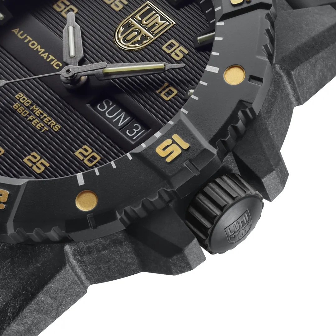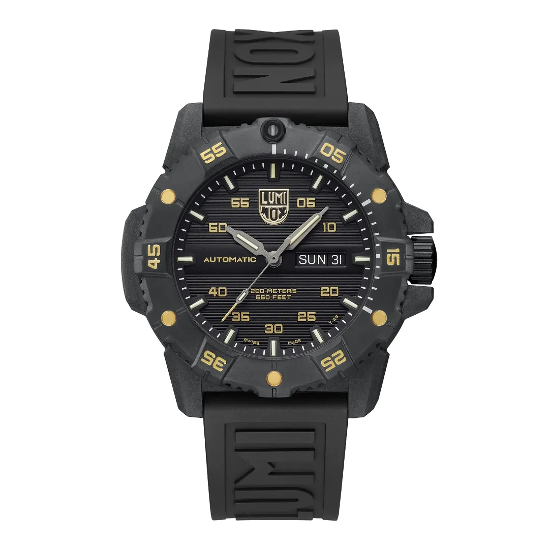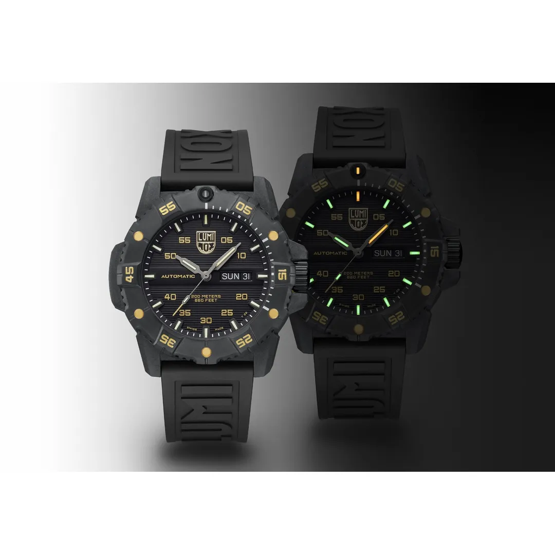 The Master Carbon SEAL Gold Limited Edition is an exceptional blend of superior performance and refined style. The limited-edition timepiece is capped at just 999 pieces worldwide and features a striking black and gold design. The case is made of Luminox’s proprietary CARBONOX+™ material, which is three times lighter than titanium, offering both strength and comfort. Its black IP plated 316L stainless steel bezel and black cut-to-fit rubber strap ensure a robust build while maintaining a sleek, modern aesthetic. Powered by a Swiss Automatic SELLITA SW220-1 movement, the watch delivers precise timekeeping with a 38-hour power reserve. The exhibition case back allows wearers to admire the intricate Swiss engineering that drives the Master Carbon SEAL’s unmatched performance. Engineered for adventure, the watch boasts a water resistance of up to 200 meters (660 feet) and features Luminox’s signature Light Technology, ensuring constant visibility for up to 25 years, regardless of light conditions. Whether you’re navigating through challenging terrains or stepping into a formal setting, the Master Carbon SEAL Gold offers an impeccable combination of resilience, strength and exclusivity.