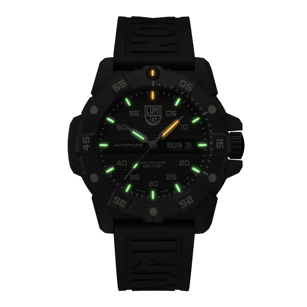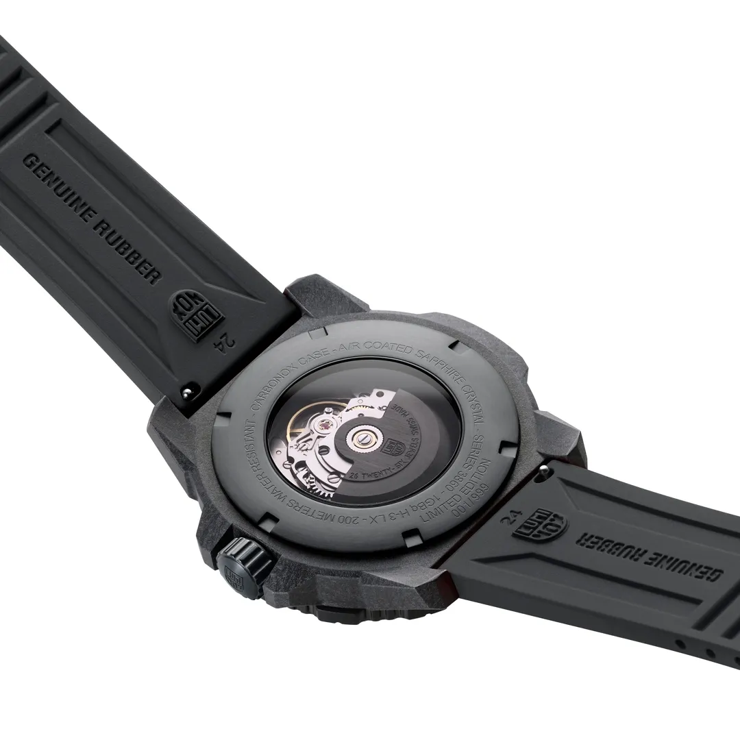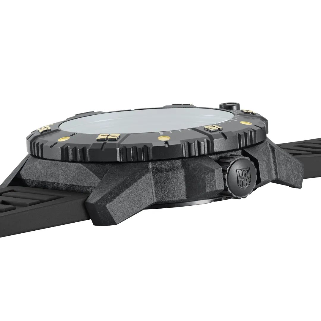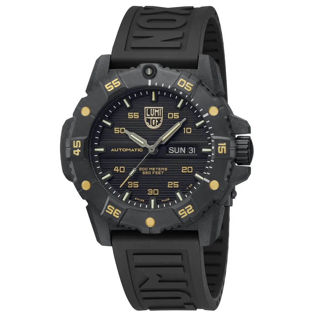 The Master Carbon SEAL Gold Limited Edition is an exceptional blend of superior performance and refined style. The limited-edition timepiece is capped at just 999 pieces worldwide and features a striking black and gold design. The case is made of Luminox’s proprietary CARBONOX+™ material, which is three times lighter than titanium, offering both strength and comfort. Its black IP plated 316L stainless steel bezel and black cut-to-fit rubber strap ensure a robust build while maintaining a sleek, modern aesthetic. Powered by a Swiss Automatic SELLITA SW220-1 movement, the watch delivers precise timekeeping with a 38-hour power reserve. The exhibition case back allows wearers to admire the intricate Swiss engineering that drives the Master Carbon SEAL’s unmatched performance. Engineered for adventure, the watch boasts a water resistance of up to 200 meters (660 feet) and features Luminox’s signature Light Technology, ensuring constant visibility for up to 25 years, regardless of light conditions. Whether you’re navigating through challenging terrains or stepping into a formal setting, the Master Carbon SEAL Gold offers an impeccable combination of resilience, strength and exclusivity.