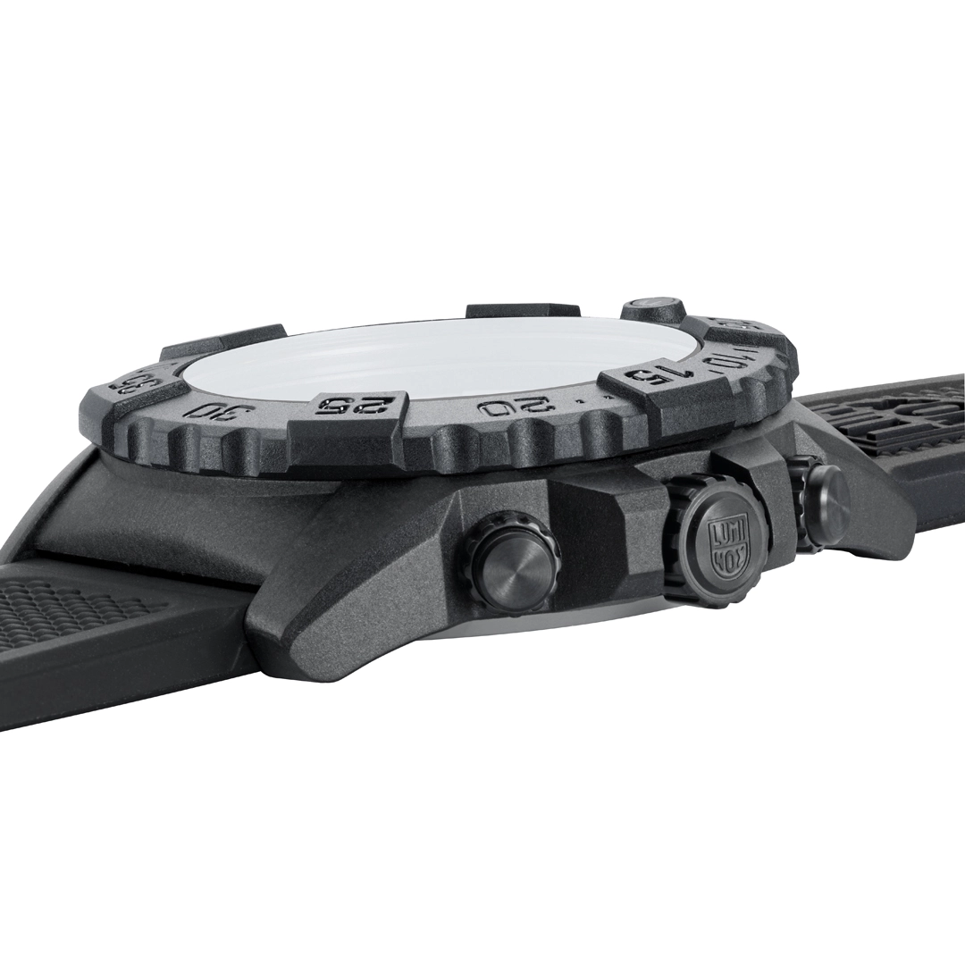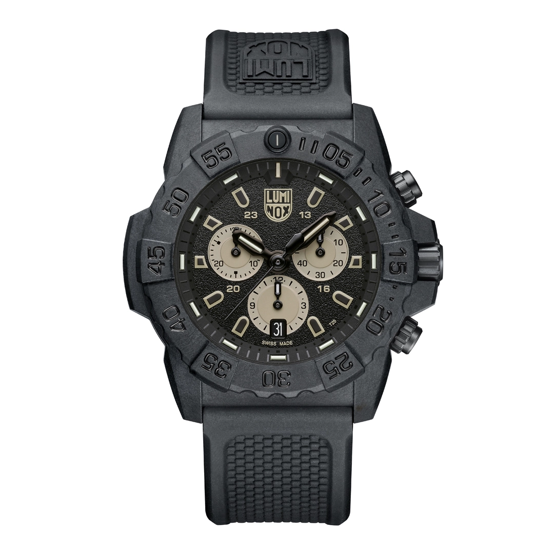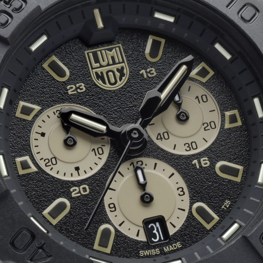 Built for those who operate without limits, the Navy SEAL 3587 reflects the close partnership Luminox has had with the U.S. Navy SEALs for over 30 years. The 45mm case is crafted from CARBONOX™, delivering exceptional strength while remaining lightweight and comfortable at just 80g. Equipped with Luminox Light Technology (LLT), the watch is Always Visible, providing a constant glow for up to 25 years in any light condition. Powered by a Swiss Made RONDA 5030.D quartz chronograph movement, it offers precision time tracking with 200 meters of water resistance. The sand and black colourway pays tribute to desert deployments, combining tactical functionality with a bold, mission-ready aesthetic.