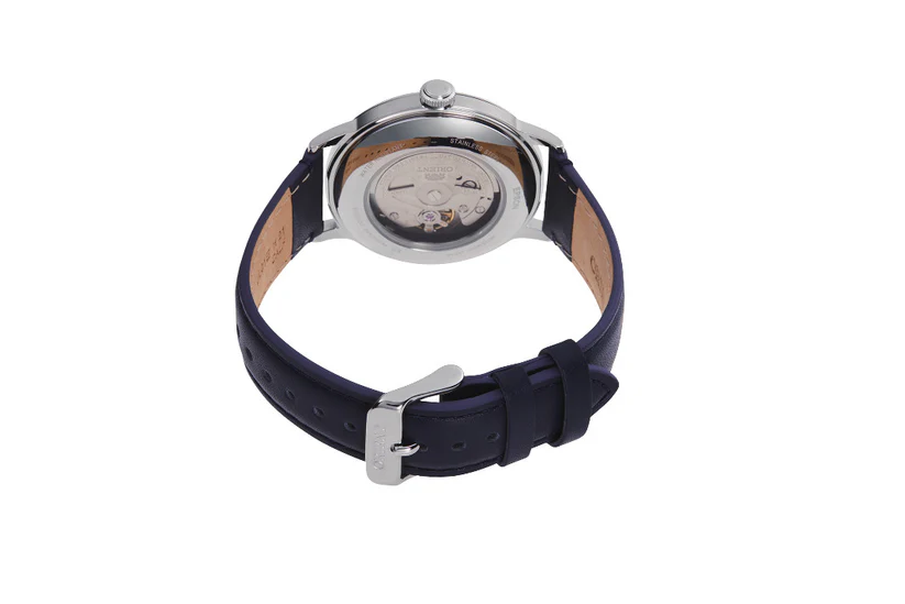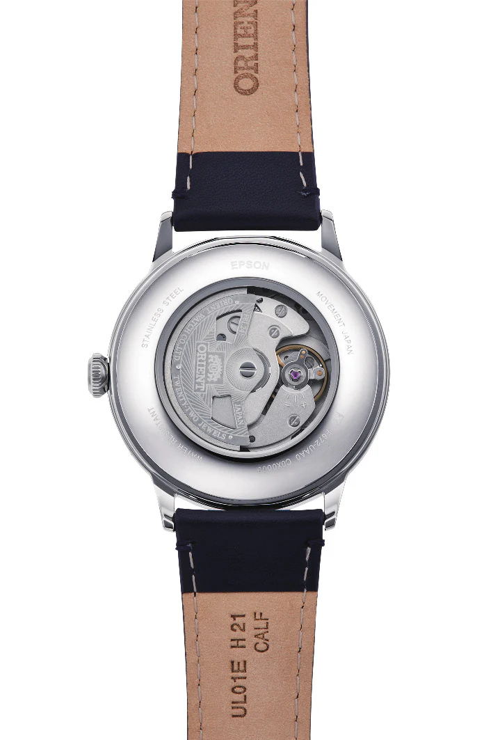 Powered by an in-house automatic movement with hand-winding capability, this timepiece offers a 40-hour power reserve. The transparent case back allows a view of the finely crafted mechanical movement, showcasing Orient’s watchmaking heritage.
