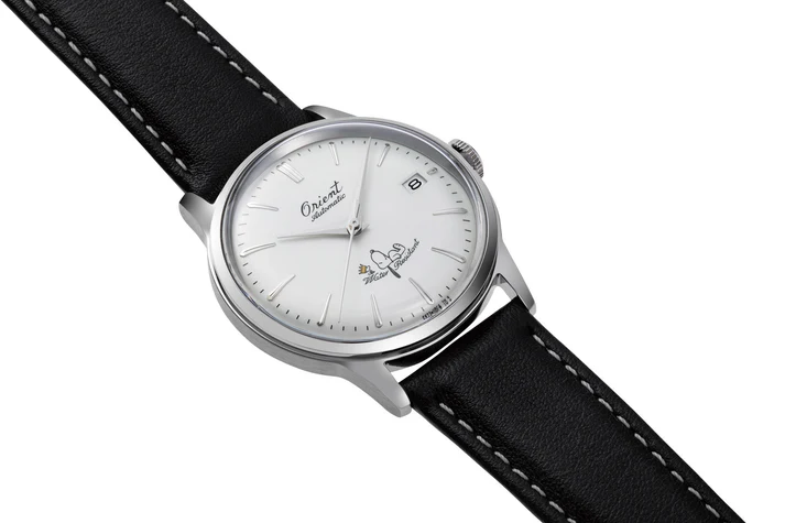 Adorned with Orient’s original cursive logo at 12 o’clock and a witty touch of Woodstock replacing the numeral “1” in the date display, this watch is a fusion of classic elegance and playful nostalgia.