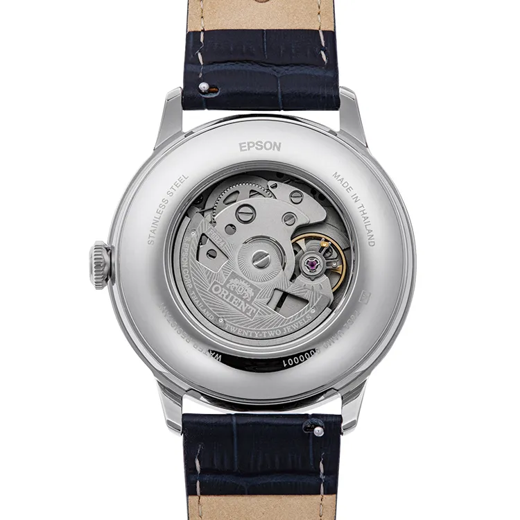 Powered by Orient’s reliable in-house F6B24 mechanical calibre, this timepiece supports both automatic and hand-winding functions. With over 40 hours of power reserve and an accuracy range of +25 to –15 seconds per day, it ensures dependable performance for daily use.