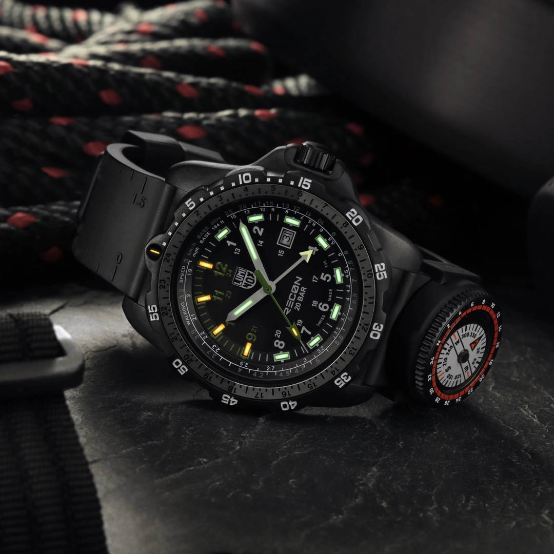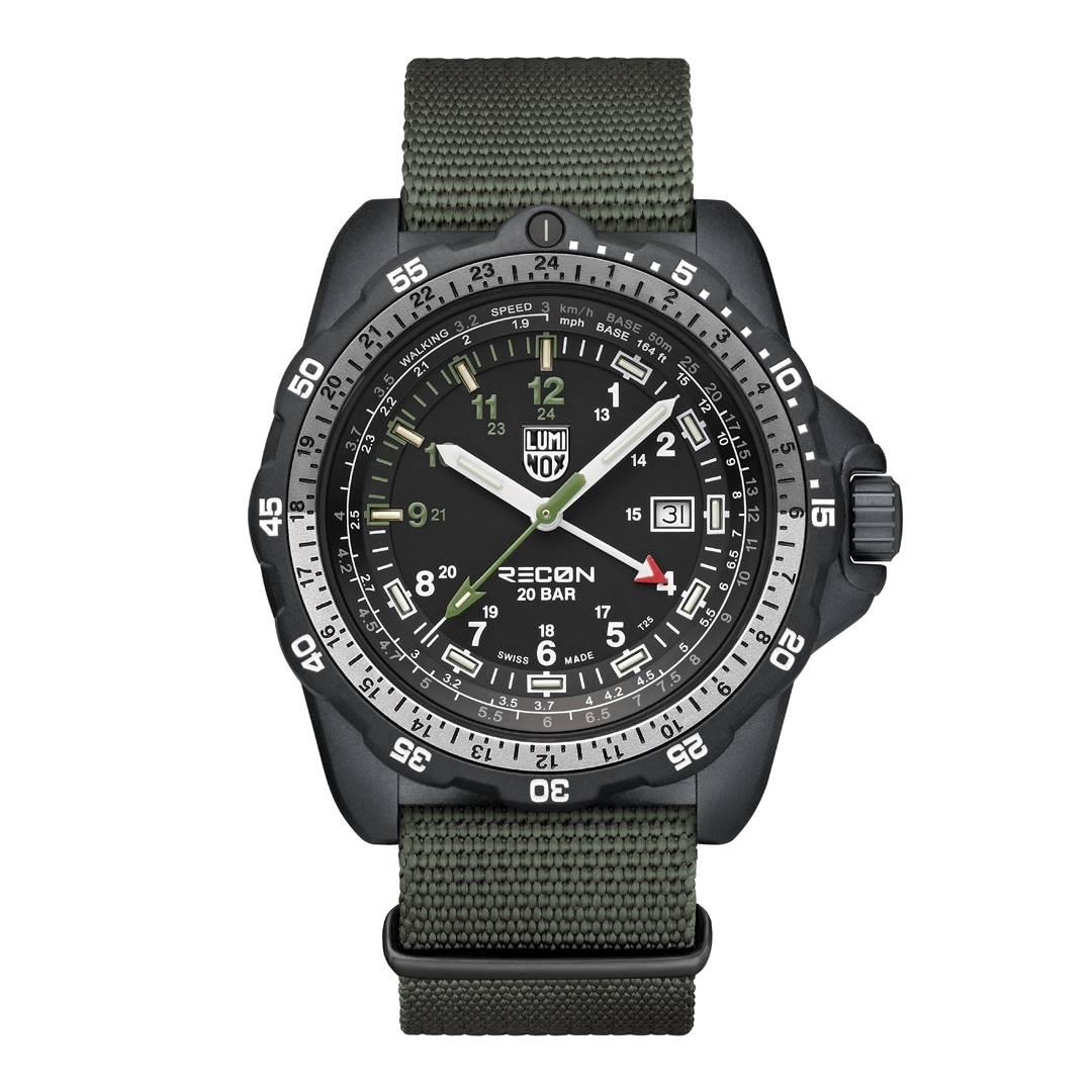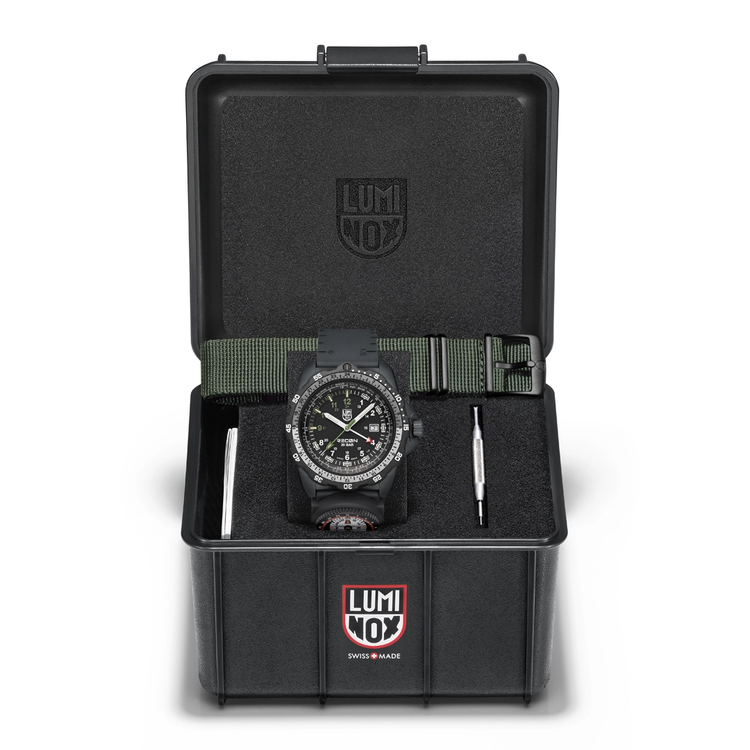 Built in collaboration with tactical specialist Andrea Micheli, this rugged 46 mm timepiece is engineered for precision navigation. The XL.8837.SET is constructed from a lightweight yet ultra-durable CARBONOX™ case and a unidirectional rotating bezel with a two-tone aluminium ring insert. The indexes 9-12 and the second hand in grasshopper green create an interesting colour highlight. The dial is protected by a sapphire crystal with anti-reflective coating, and the watch is water resistant up to 200 metres. Powered by a Swiss quartz GMT movement, the XL.8833 lets you track two time zones simultaneously perfect for global missions or international travel. The black nitrile rubber strap includes integrated map scales and ruler markings, plus a detachable compass, transforming the watch into a complete navigation instrument. This set comes with an additional grasshopper green webbing strap for added versatility. Thanks to Luminox Light Technology, the XL.8837.SET remains visible in all light conditions with a constant glow lasting up to 25 years.