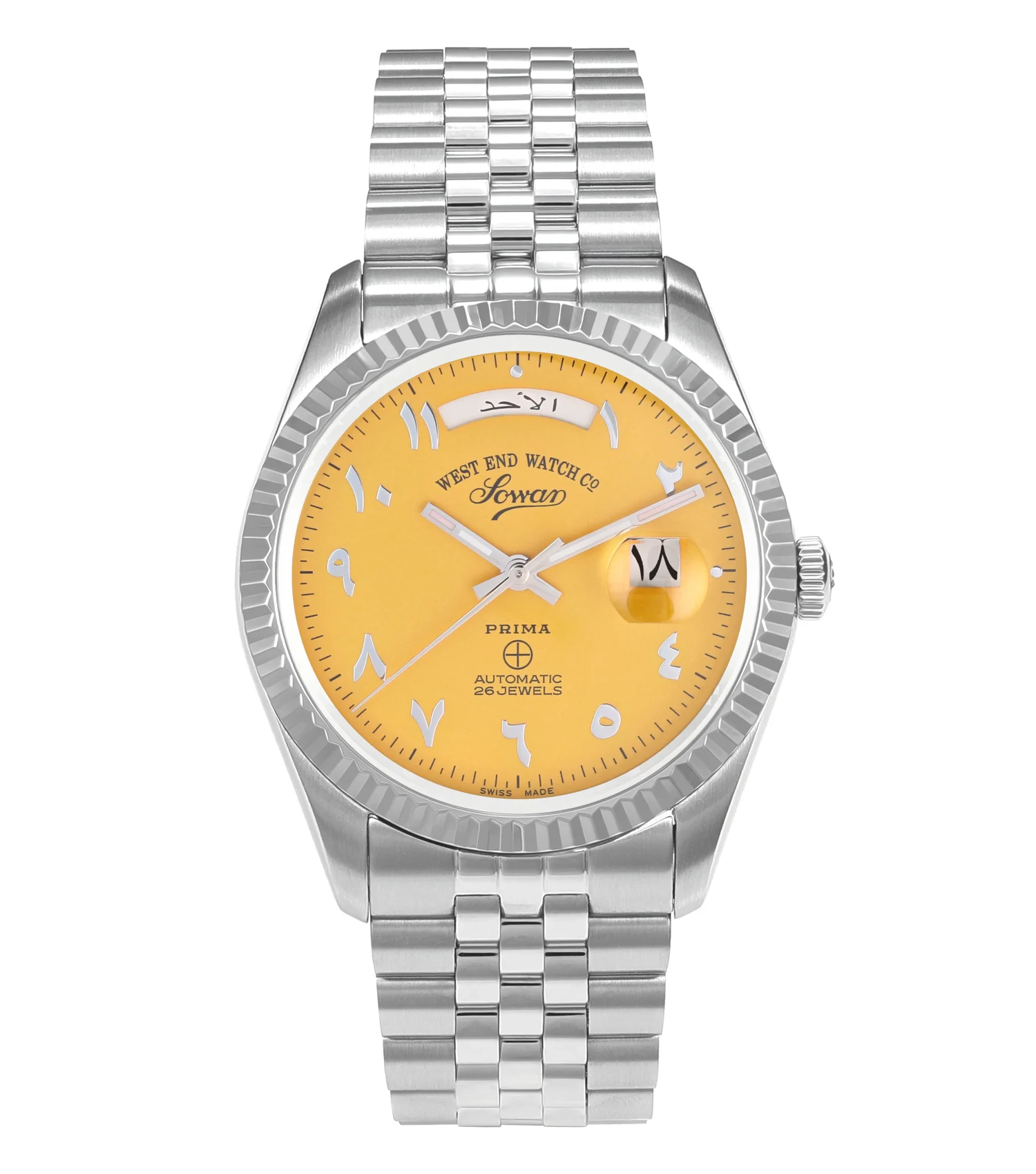 A bold yellow Arabic dial meets silver steel elegance — the 41mm West End Automatic is built to stand out, and made to last.