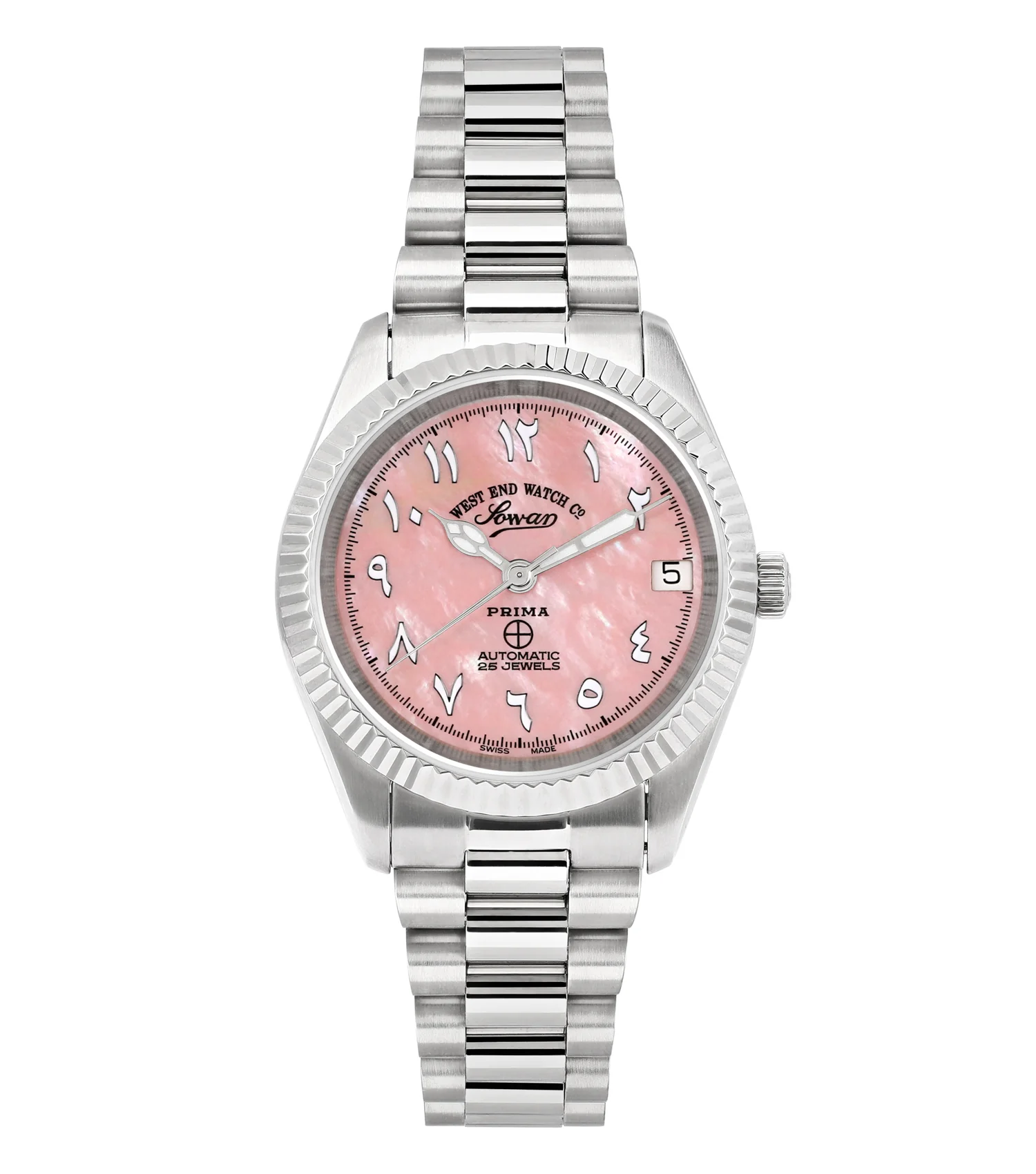 A graceful 32.5mm women’s automatic watch by West EndWatch Co. featuring a M.O.P. pink dial with Arabic Numerals and polished silver stainless steel bracelet.