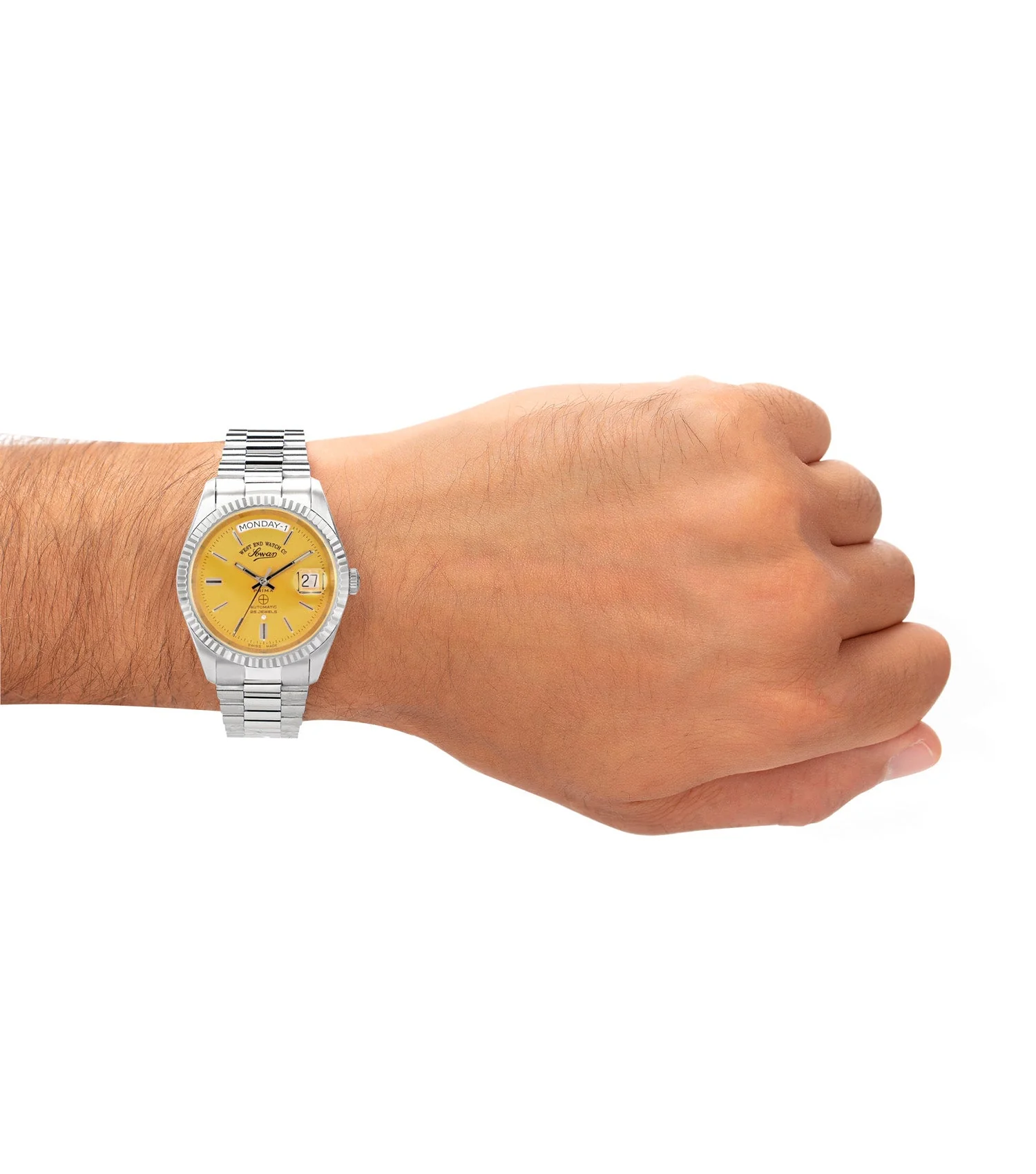 With its heritage rooted in Swiss craftsmanship, the West End Watch Co. Classic Automatic 37mm is a refined statement of timeless elegance. The radiant yellow dial adds a bold twist to its classic round design, while the automatic movement ensures precision without compromise. Encased in polished stainless steel, this timepiece blends sophistication and durability — an ideal companion for the modern gentleman.