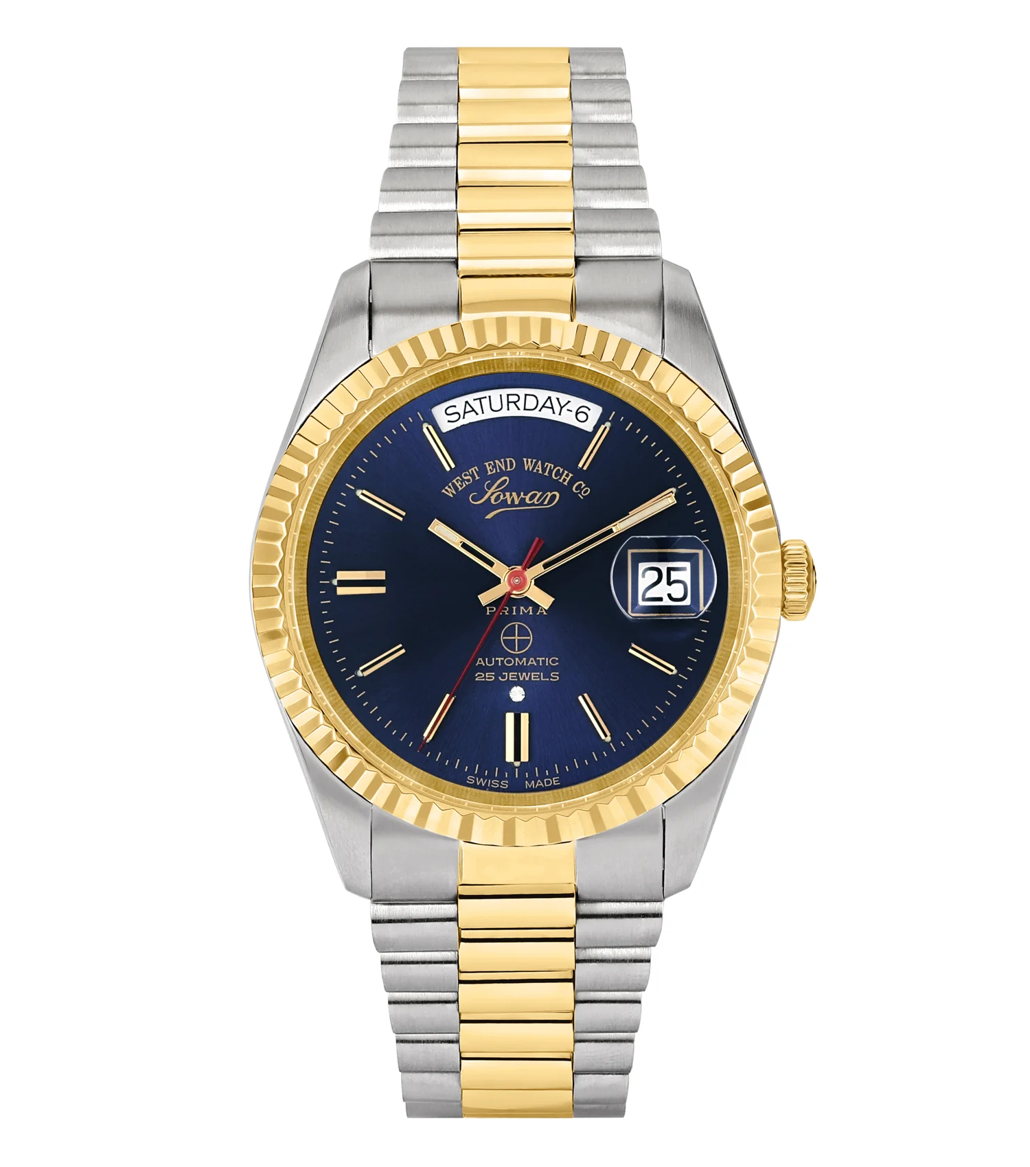 This 37mm West End watch stands out with its two-tone finish and bold blue dial. A refined blend of classic styling and Swiss-Made automatic movement.